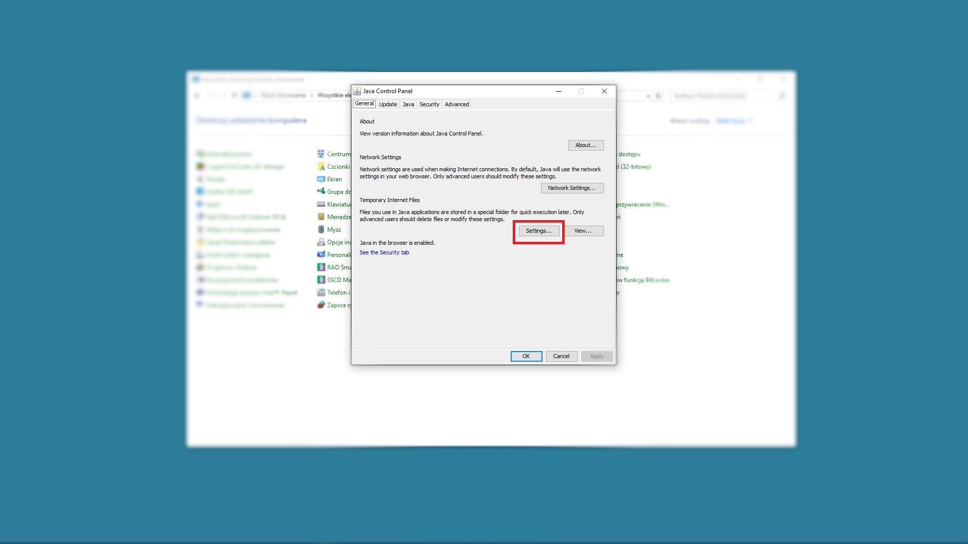 W okienku JAVA CONTROL PANEL w zakładce GENERAL wybieramy SETTINGS