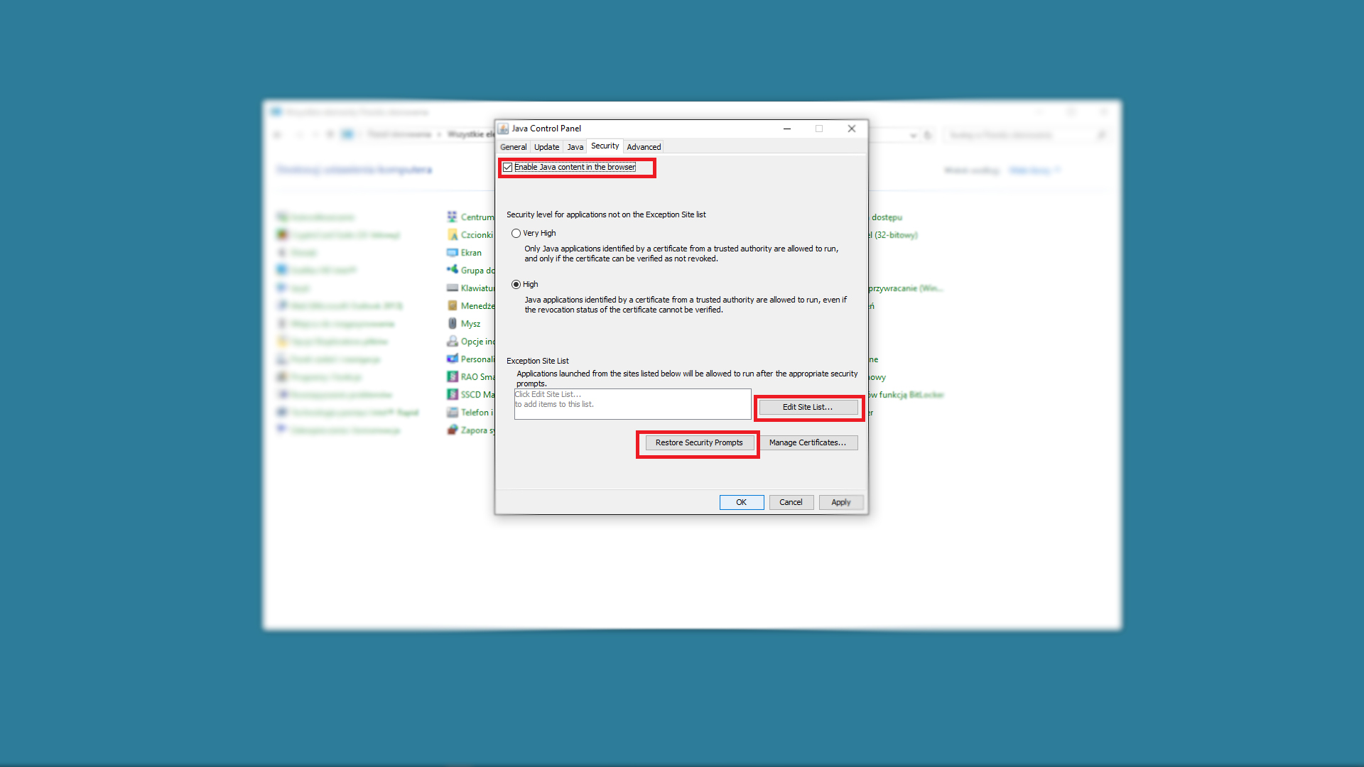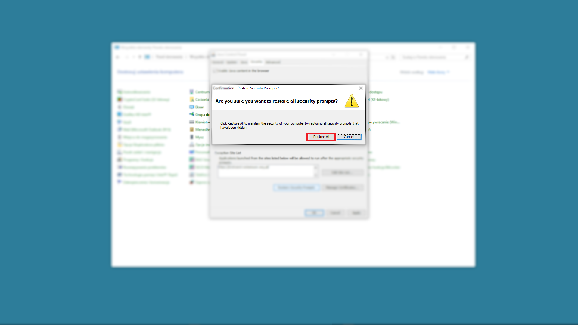 Czasami podczas pierwszego uruchomienia wtyczki po aktualizacji z rozpędu zablokujemy wtyczkę przy wyskakującym komunikacie. Przycisk Restore Security Prompts resetuje wszystkie komunikaty dotyczące wtyczek JAVA.
