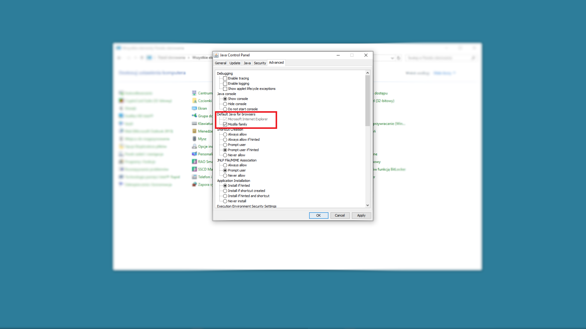 Domyślnie JAVA jest włączona jedynie dla Microsoft Internet Explorer, powinna być również włączona dla Mozilla Family
