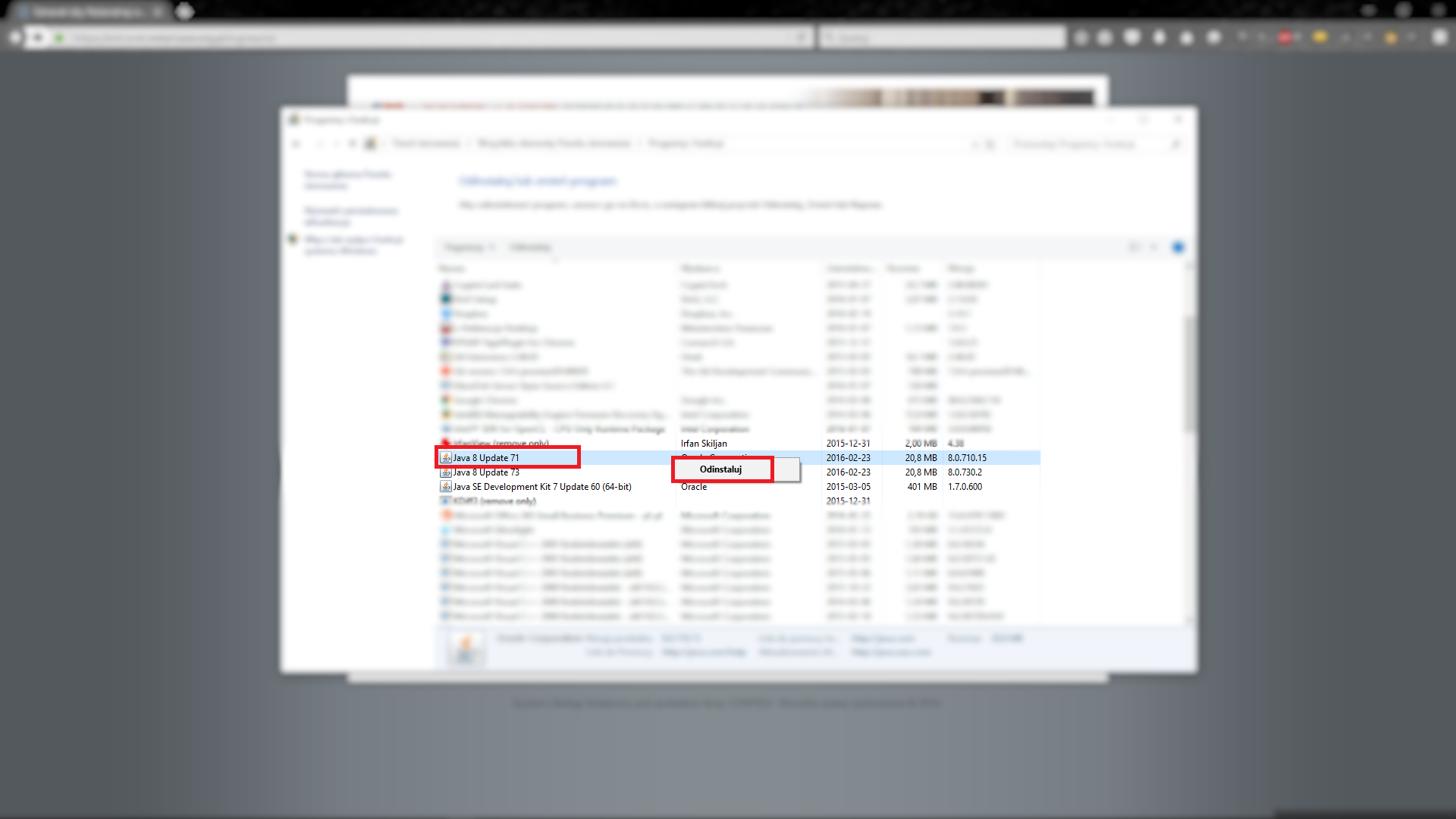 Zdarza się, że przestarzałe wersje JAVA mają wpływ na najnowszą wersję. Należy je odinstalować. Wpływ mogą mieć wszystkie wersje JAVA z nazwą