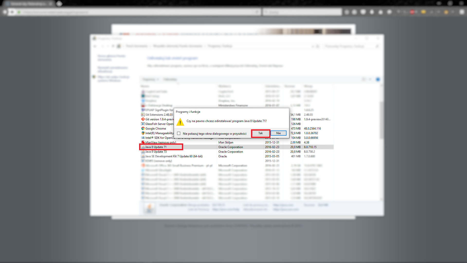 Potwierdzamy odinstalowanie przestarzałych wersji JAVA