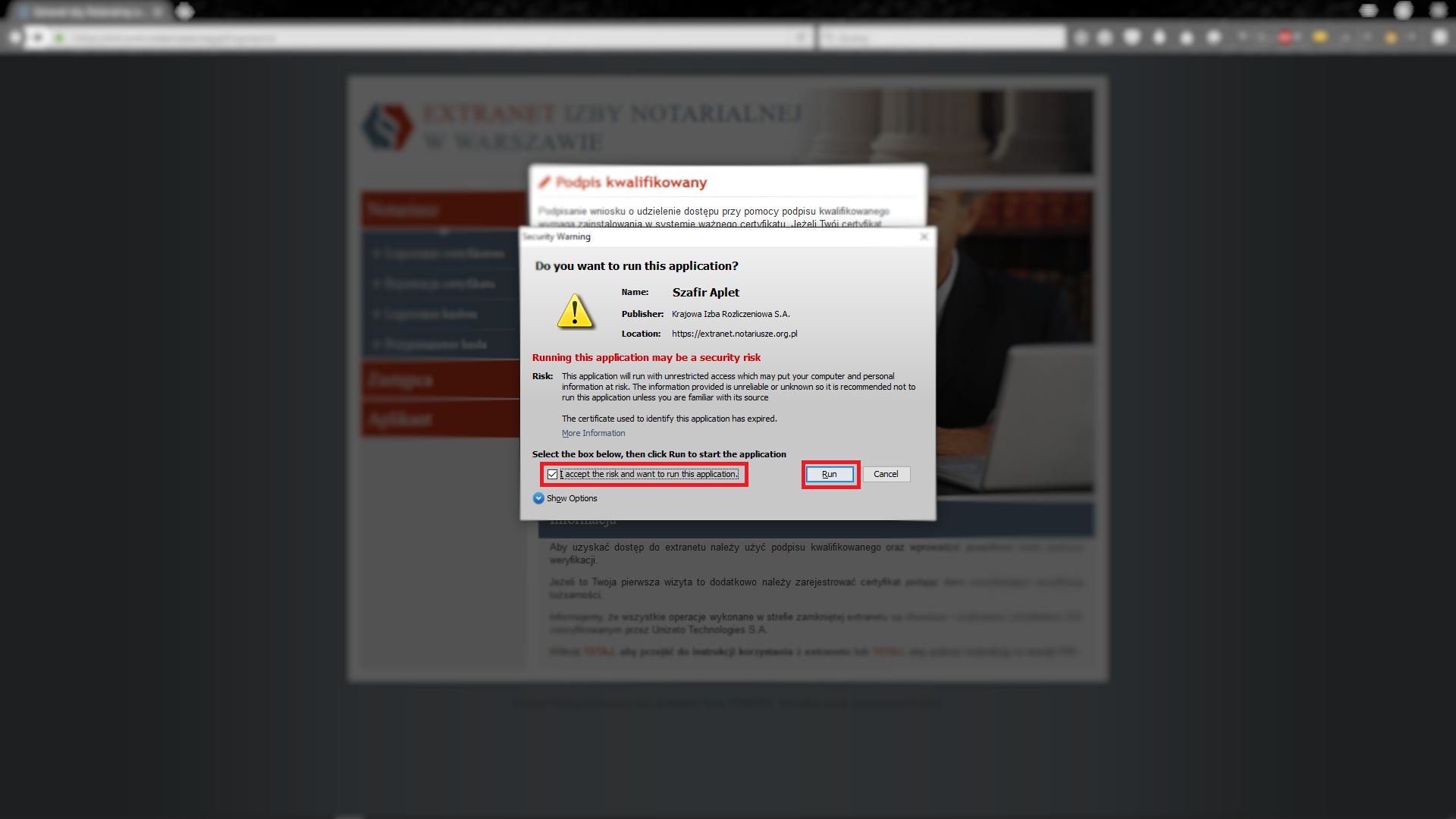 Weryfikacja tożsamości na podstawie podpisu kwalifikowanego wymaga uruchomienia apletu "Szafir Aplet". Jest to dodatek do przeglądarki umożliwiający odczytanie potrzebnych informacji z podpisu kwalifikowanego. Został stworzony przez Krajową Izbę Rozliczeniową i nie stanowi on żadnego niebezpieczeństwa dla Państwa komputerów. Domyślnie większość przeglądarek blokuje wszystkie dodatki dla przeglądarek. Poniżej zdjęcia prezentujące w jaki sposób dopuścić do uruchomienia dodatku "Szafir Aplet".