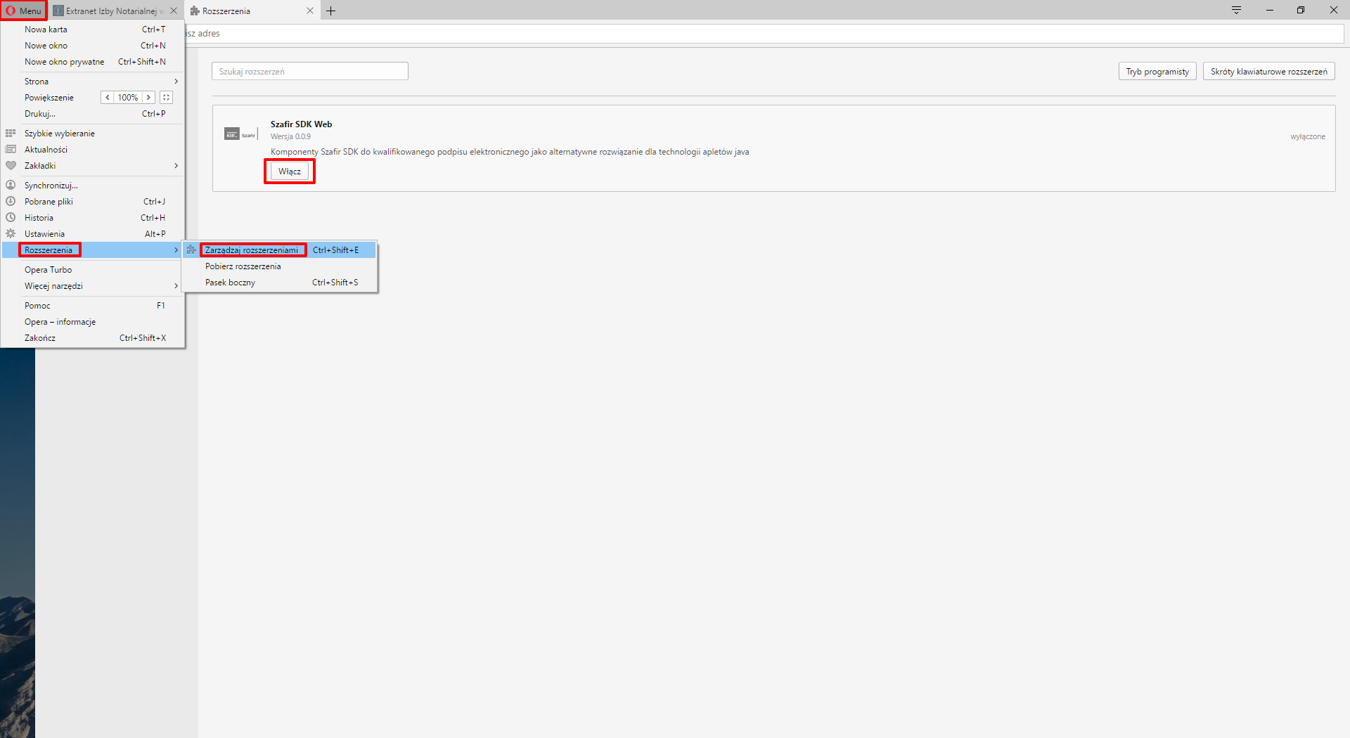Jeżeli mimo zainstalowanego rozszerzenia wyświetla się komunikat o jego braku należy sprawdzić, czy rozszerzenie jest włączone.